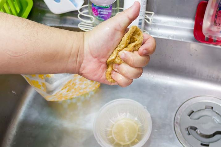 通常売られている味付け油揚げは甘いタレで味付けされているので、さらっと水洗いしたあと、絞って糖分を抜く。出ていけ、糖質!