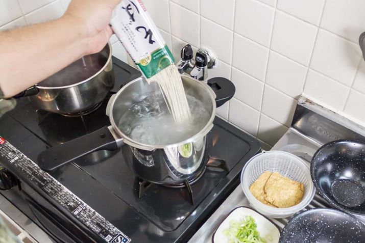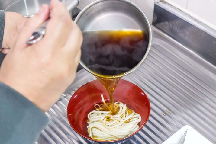 作り方は普通の乾麺のそばと同じ。ゆで時間は冷たいそばで6〜7分。温かいそばで5〜6分だ。その間に「つゆ」を希釈して温めておかなくてはならない(写真奥)