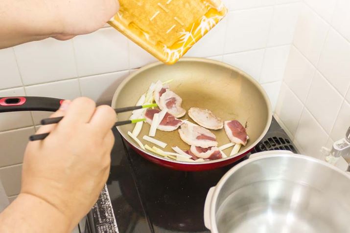 鴨とネギは、フライパンで焼き目を付ける。火を通しすぎると鴨肉はポソポソになるので、半生状態で温かいつゆとともに一緒に瞬間ゆでする