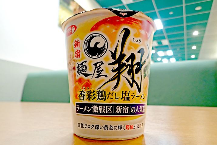「麺屋 翔」の塩ラーメンを再現したカップ麺「香彩鶏だし塩ラーメン」(サンヨー食品)。お店の味とコラボカップ麺の味を食べ比べてみます