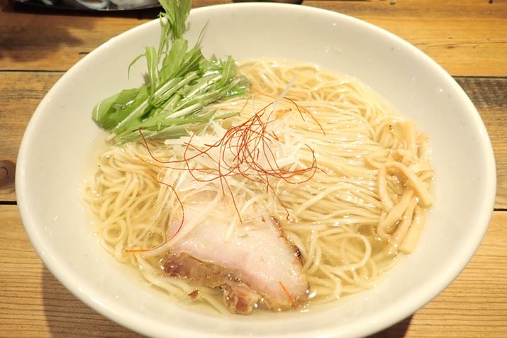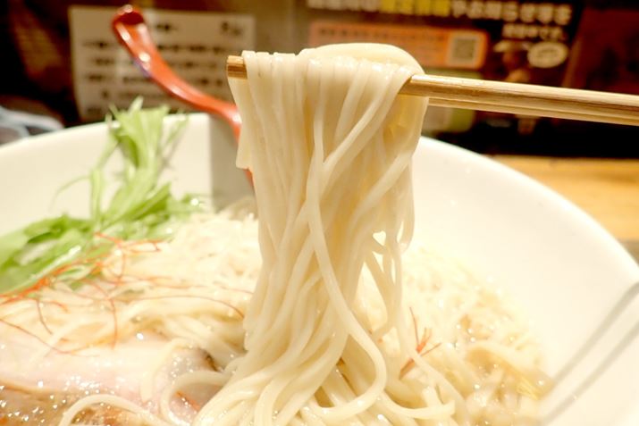 麺は、稲庭うどんを連想させる、平打ちストレートタイプ。やわらかめに茹でてありながら、しっかりコシがあって、食べごたえもあります。このほか具材では、白髪ねぎの辛みや水菜に苦味が、塩スープのよきアクセントに。