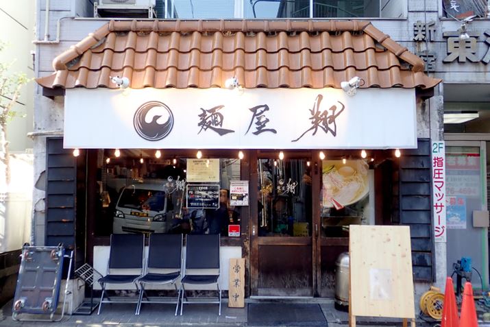 「麺屋 翔」。JR各線「新宿」駅(西口)より徒歩9分、都営大江戸線「新宿西口」駅(D3出口)より徒歩6分、西武新宿駅から321m。営業時間は、平日11:00〜15:00、18:00〜23:00、土・日・祝11:00〜15:00、17:00〜21:00。スープ切れ次第閉店(2018年1月31日時点。「食べログ」より)