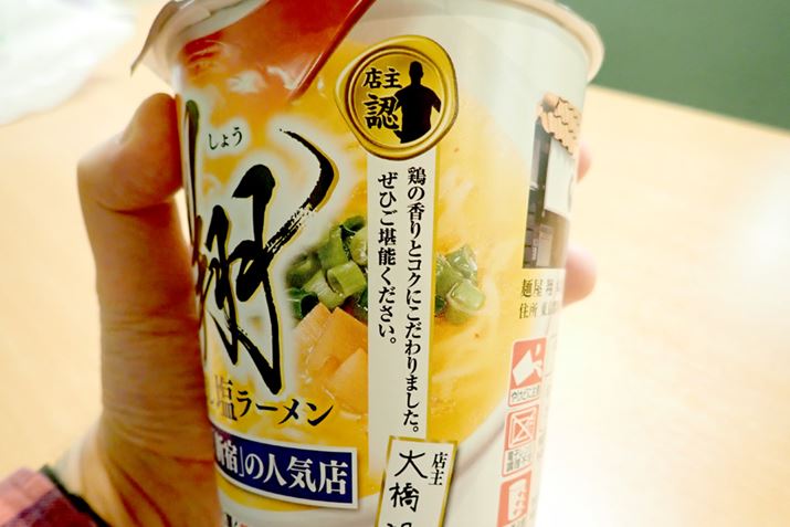 カップ麺には、「鶏の香りとコクにこだわりました。ぜひご堪能ください」という店主からのメッセージも。よく見ると、「店主 認」というロゴまで。とにかくすごい自信だ