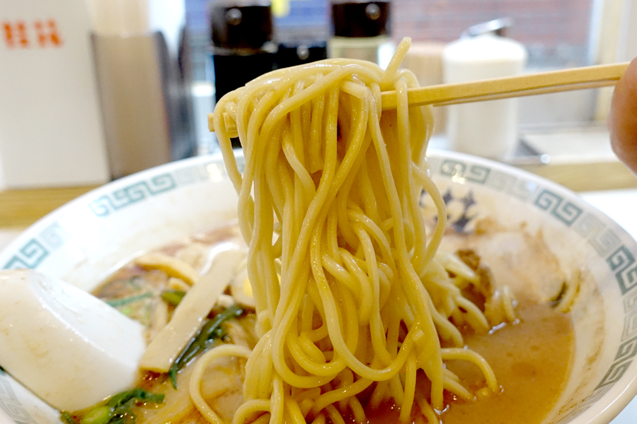 麺も、お店と同様に中太で、姿はそっくり。実際に食べてみると、ややつるみがあるものの、味はとても似ています。生麺タイプに近く、完璧な再現度のスープとあわせて、臨場感があり、先ほど食べた桂花拉麺をすぐに思い出させてくれました。