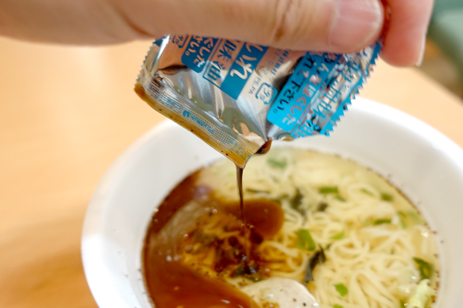 お湯を入れて5分経過した後、液体の特製調味油を入れます