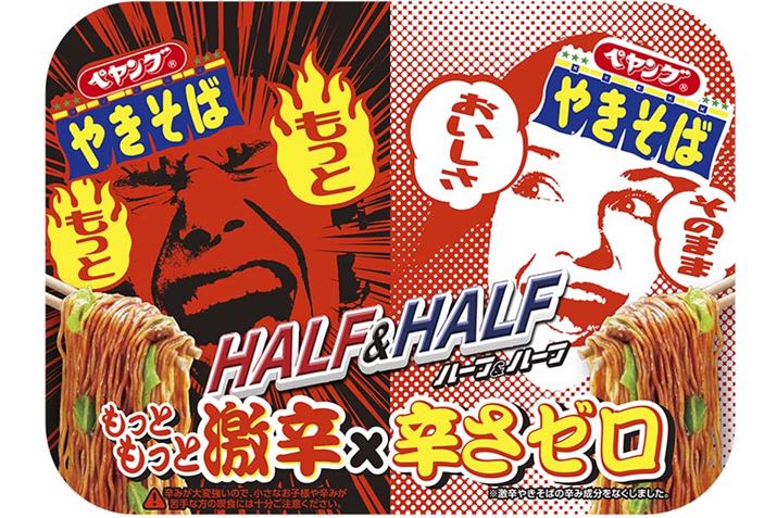 激辛と辛さゼロを合体させるという発想が斬新な「ペヤング 超大盛やきそばハーフ&ハーフもっともっと激辛×辛さゼロ」(2018年2月)。でも、中和してちょうどよくなるわけじゃない