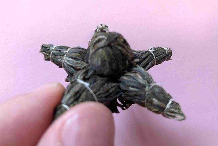 こちらが「櫻花恋歌」の茶葉。手摘みの茶葉を1枚ずつ手でもんで細長く伸ばし、それを糸で束ね、中に花を包み込んで作り上げていきます。茶葉をながめているだけでも結構楽しめますよ