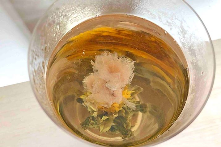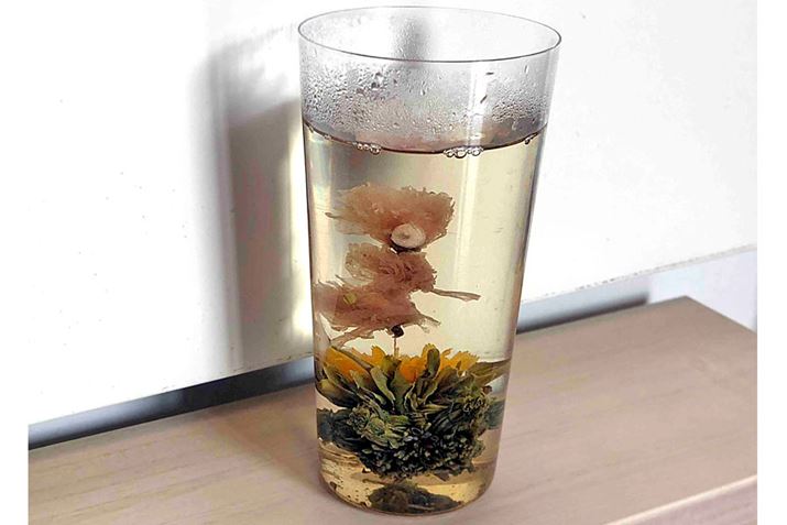 熱湯を注げるガラス容器に茶葉を入れ、熱湯を注いで花が開くまで2〜3分待ちます。できればふたをします