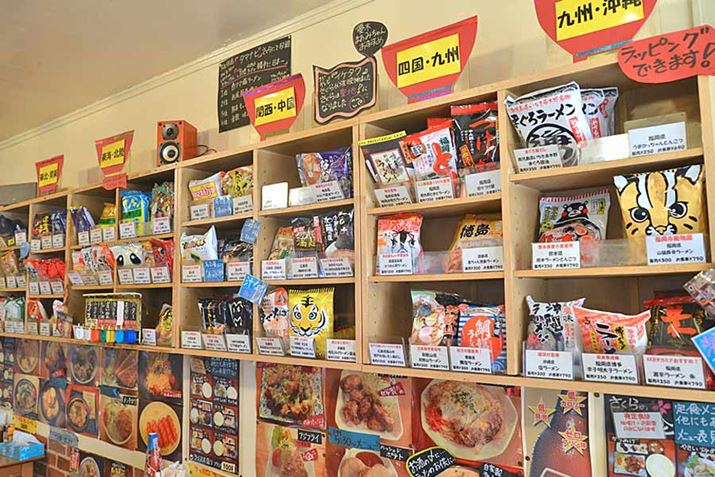 同店には大きな棚があり、基本的には都道府県別にご当地袋麺が並べられています。そこからまずはラーメンの味の4大ジャンルといえる、醤油(しょうゆ)、塩、味噌(みそ)、豚骨の4つからおすすめを教えてもらいました。