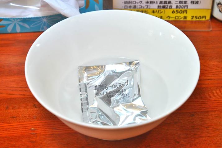 丼にスープを袋のまま入れて、お湯を注(そそ)いで準備。特に冬場は油が固まりやすく、スープの中身を出しづらくなるため重要とのこと