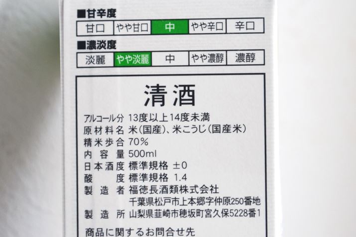 これは純米酒。どの日本酒もラベルを見ると、それがどのカテゴリーに入っているかがわかり、商品によっては甘さや辛さを示す「日本酒度」などが書いてあります