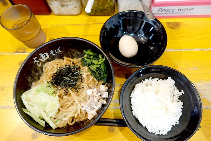 「元祖 家系油そば」(680円)+「味玉」(100円)を注文。オールタイムで麺の大盛りが無料、さらに11時から17時はライス1杯が無料ということで、ランチタイムに注文するとこんな感じに。満足すぎるボリューム!