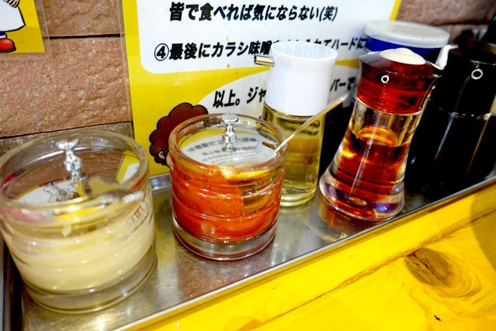 カスタマイズを存分に楽しめるのも、家系ラーメン店の楽しみのひとつ。このほか、酢漬けしょうがなどがありました