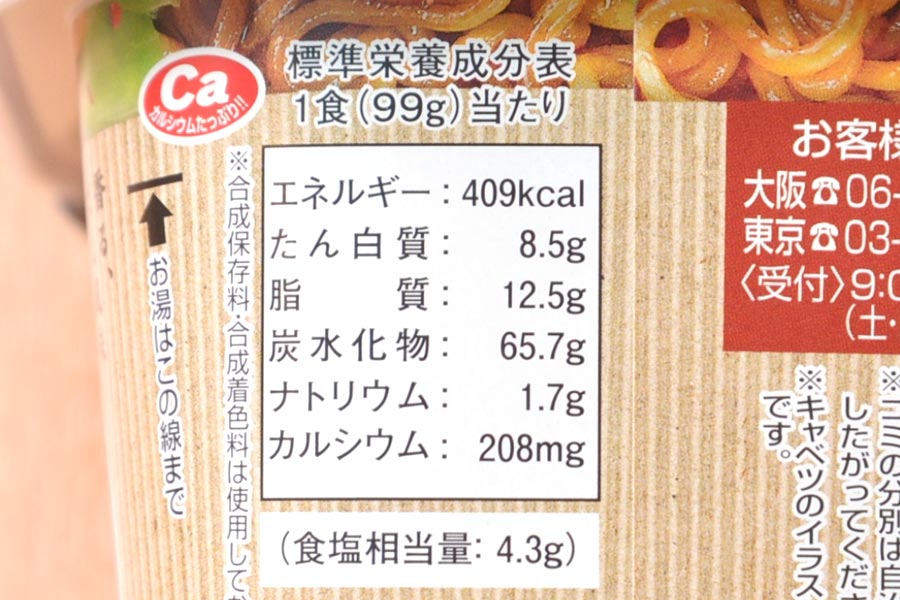 成分はこのとおり(麺は90g)。ご存じの方も多いでしょうが、カップ焼きそばは通常サイズでもなかなかボリューミーです(たとえば「カップヌードル」は1食77g(麺は65g)で353kcal)