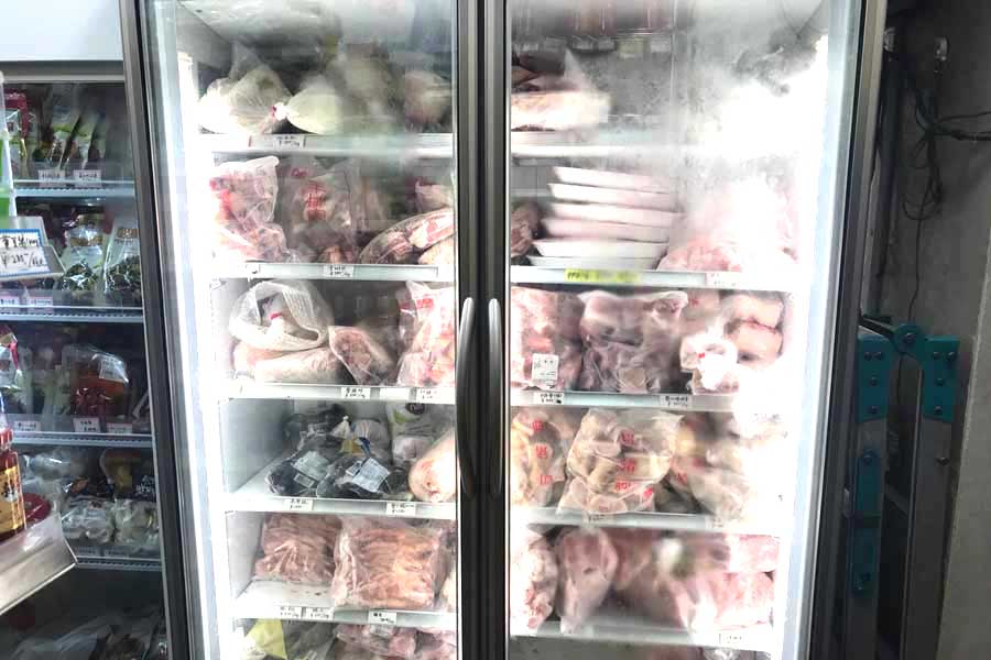 意を決して中に入ると、奥の方に目当ての肉ゾーンが。冷蔵庫右側の2段目に無造作に積まれているパックが羊肉。「大」(目算でおよそ500〜600g)で800円。大って何……?