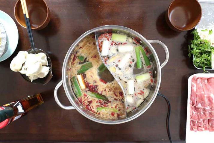まずは、羊のマークの「小肥羊」にチャレンジ。見栄えを考えて2色鍋を用意したので、鍋の半分は同じ小肥羊の辛くないバージョン(緑のパッケージ)を入れます。
