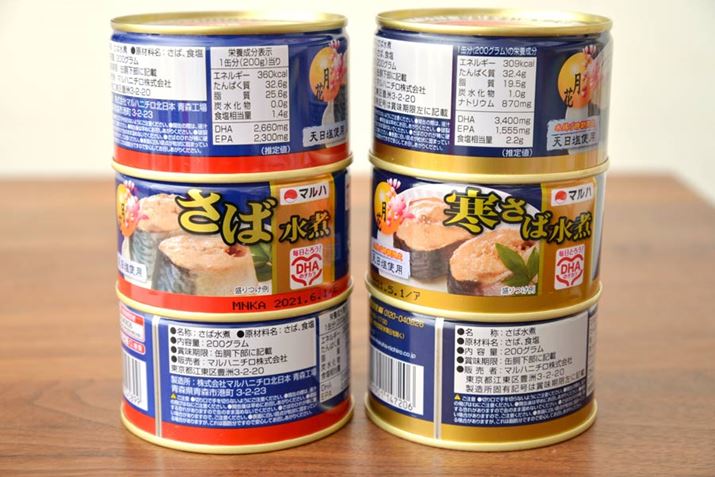 味の感想は、「月花寒さば水煮」のほうが身や脂の旨みが濃厚で塩味にキレがある印象。通常タイプのほうがややカロリーや脂質は高めなのですが、食塩相当量が「月花寒さば水煮」のほうが多い分、濃厚に感じたのかもしれません。寒サバとは特に脂のりがいい冬に漁獲したサバのことで、缶には「水揚げ時期限定」と書いてあります。素材の持つ脂の旨みが、「月花寒さば水煮」にはより凝縮されているのかもしれません。