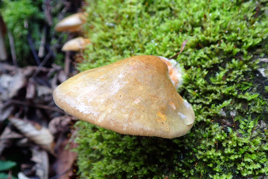しばらく歩いていると、このポンポコ山で初めてとなるキノコを苔(こけ)だらけの倒木で発見。頭の中にあるキノコインデックスから検索したところ、食用のヒラタケかムキタケか、あるいは毒キノコのツキヨタケあたりだろうか。