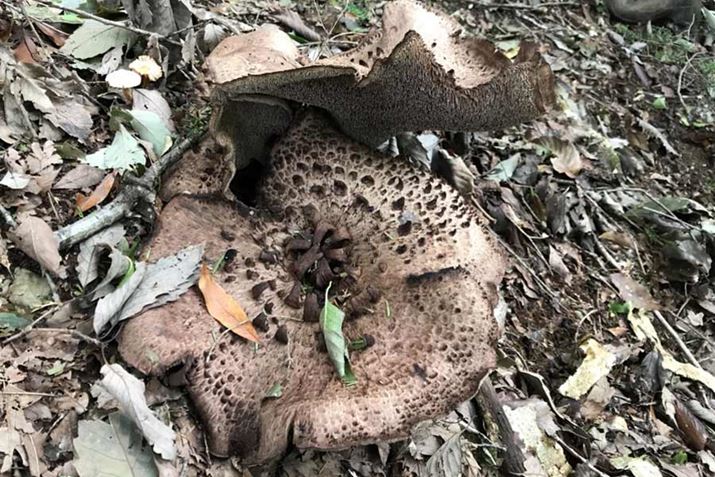 これはハナイグチという食用キノコの老菌。虫食いがすごいな