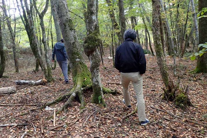右がMさん、左がPさん。生えている木の種類やそのブレンド具合などから、キノコの気配を感じ取るそうだ。アカマツの林にドングリ系の落葉樹が少し混ざるとマツタケの可能性が高いとかね