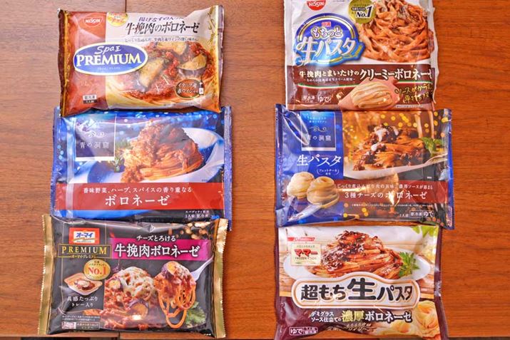 チェックしたいのは味なので、今回は3タイプのうち「プレミアム系」に焦点を絞りました。ソースも、トマト系、オイル系、クリーム系、和風など多岐にわたるのですが、いわゆる王道のミートソースをチョイス。ただしプレミアム系の場合ミートソースとはいわず、本場にあやかった「ボロネーゼ」(正式名称は「ラグー・アッラ・ボロネーゼ」。ボローニャ風の煮込みという意味)とするのが各社の常套(じょうとう)手段のよう。ということで、ボロネーゼの「スパゲッティタイプ」と「平打ち生麺系」3商品ずつ、計6つのパスタを比較していきます!