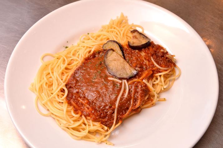 「ボロネーゼは、肉々しさが大事な料理。そこでいうと、もうちょっと粒が大きくて量も多いといいかなーとは思います。その一方でソフリット(玉ネギ、ニンジン、セロリなどの香味野菜をみじん切りにして炒めた野菜)の甘みや素材感が出ていて、あとトッピングのナスがいいですね。揚げることでジューシーになっていますし、味もしみ込んでいます。全体的にトマトの味が強く甘めの味付けで、デミグラスソースのニュアンスも。本格的とは言い切れませんが、日本人やお子さんになじみやすいという点ではこれがいいんだと思います。麺は冷凍ながらもアルデンテの芯を感じますし、やりますね!」(酒井さん)