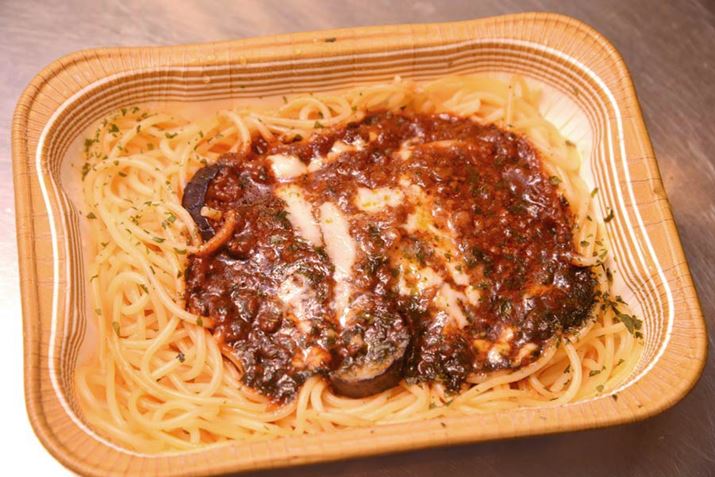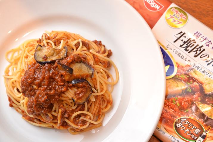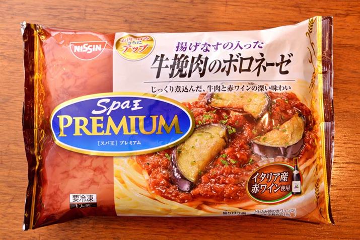 「スパ王」といえば、日清食品のパスタブランドとして有名。カップで味わうパスタなら食べたことがあるという人もいるでしょう。その冷凍の、プレミアムバージョンです。ミンチは牛肉100%。そして揚げナスとパセリ、イタリア産赤ワインなどを使っていることが特徴。「赤ワインは、肉の臭み消しで使っているのでは」と酒井さん。自身もその用途で使うとのこと。