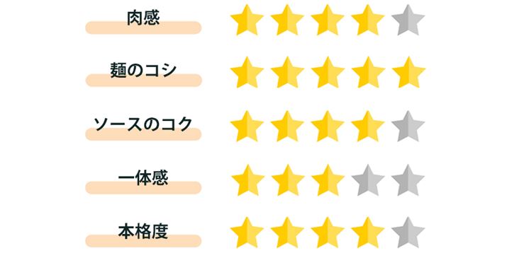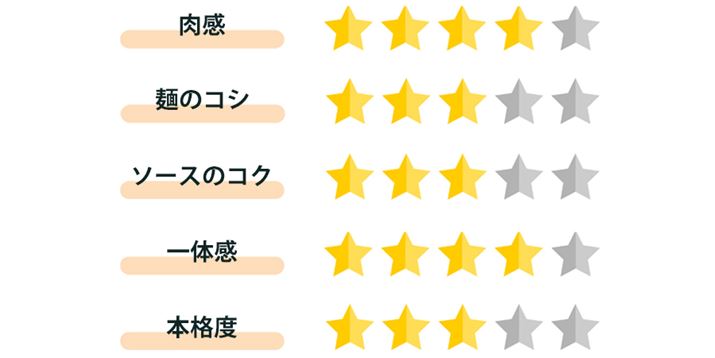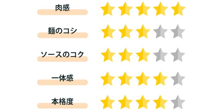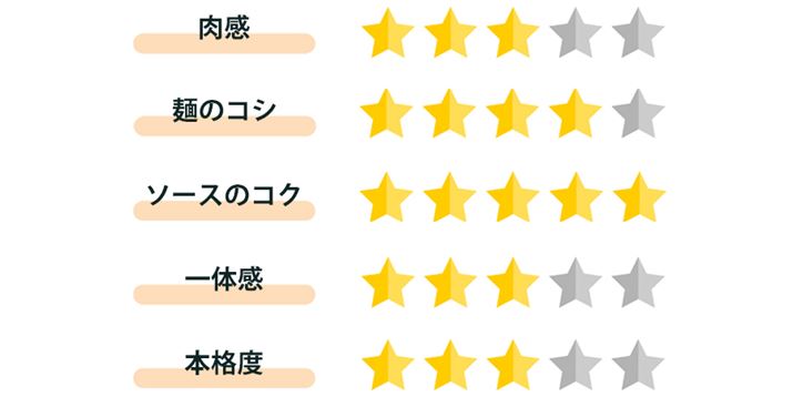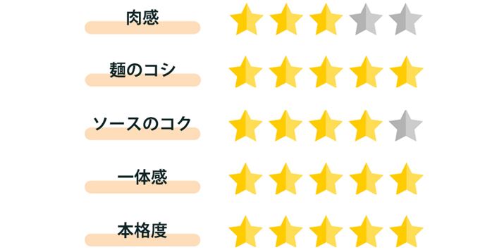 麺の種類が違えば味の感じ方もかなり変わってくるはず。ということで、まずは通常のスパゲッティタイプ3商品を比較しました。評価には星どり項目も用意。肉感、麺のコシ、ソースのコク、一体感、本格度の5つです。