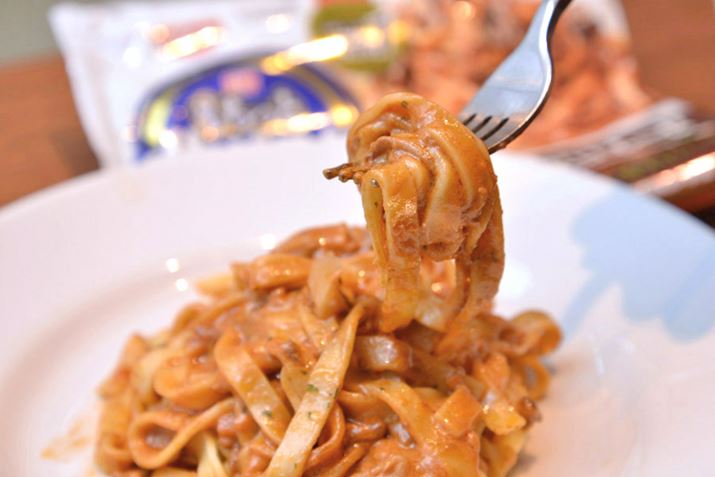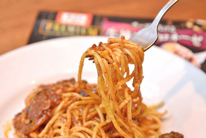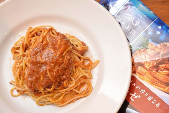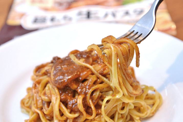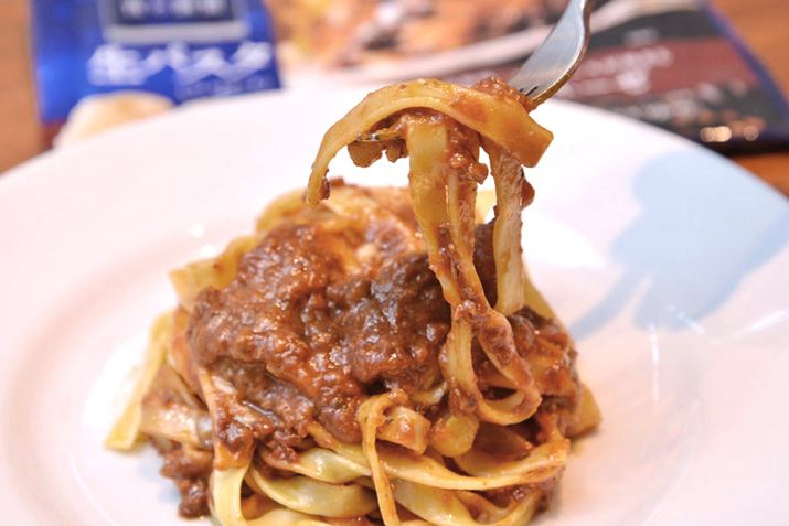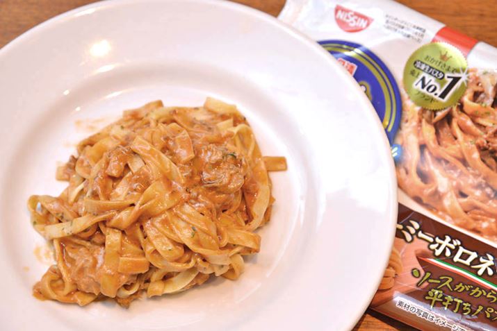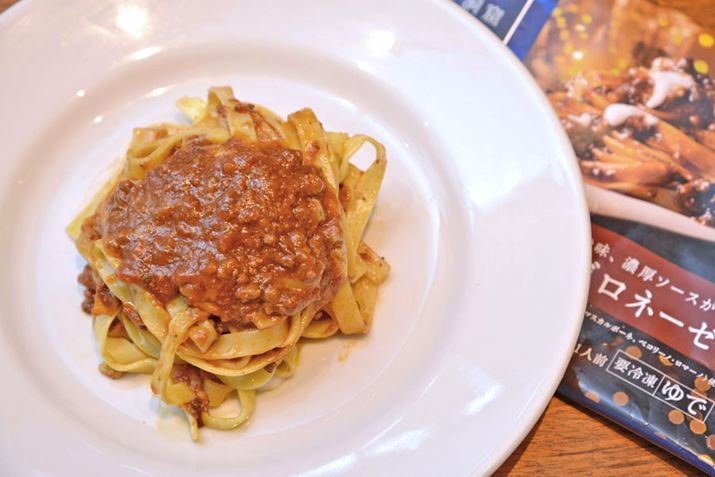 こちらは冷凍生パスタの売上No.1ブランドとのこと。ボロネーゼは、じっくりと煮込んだ牛肉と、北海道産生クリームで仕上げた濃厚な味、幅広いタリアテッレの麺が特徴。マイタケとパセリがトッピングされています。
