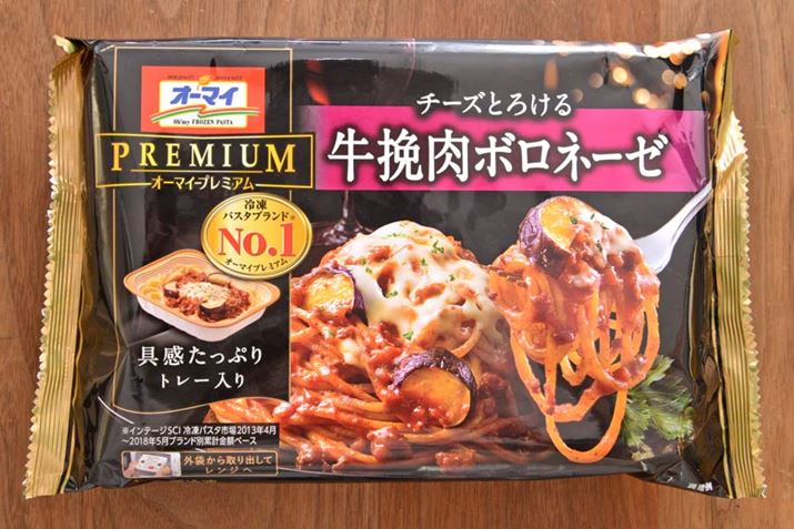 牛挽肉のうまみと赤ワインの風味を効かせ、ゴーダチーズと揚げナスをトッピングしたボロネーゼ。「オーマイプレミアム」は、冷凍パスタのブランド別累計金額でNo.1なのだそう。その実力はいかに。