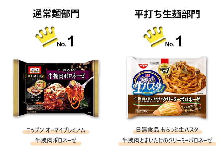 補足として、実は「オーマイ」などを展開する日本製粉には平打ち生麺のボロネーゼがありません。一方、日清フーズには「青の洞窟」と「マ・マー」の2ブランドに平打ち生麺ボロネーゼがあるため、両方を採用しました。