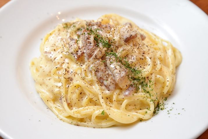 「自家製ベーコンのカルボナーラ」1000円。もちもち麺に卵黄の効いたクリーミーな濃厚ソース、パワフルなベーコンのうまみと、黒こしょうの香りや辛味がアクセントになって激ウマ!