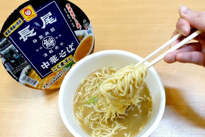 お店の味を確かめた後は、同店が監修したカップ麺「長尾中華そば こく煮干し」(278円)を食べて、その再現度を検証していきます。鶏豚ベースの白湯スープ+煮干しというWスープ、やわらかくゆでた中太ストレート麺など、あのやさしい味わいをどこまで、カップ麺で表現しているのでしょうか?