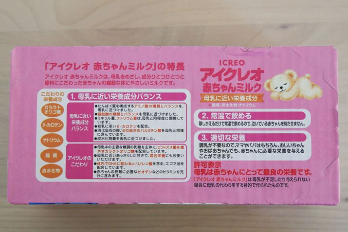 パッケージには、母乳に近い栄養成分、常温で飲めること、調乳が不要であることなど「アイクレオ 赤ちゃんミルク」の特徴が表記されています