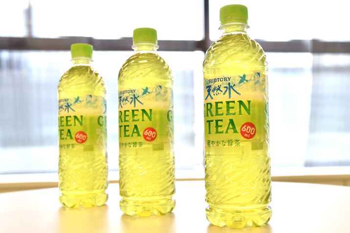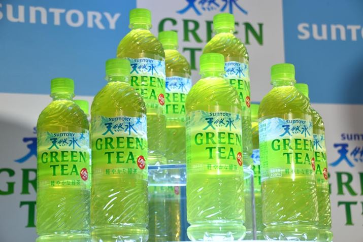 「サントリー天然水 GREEN TEA」。「サントリー天然水」ブランドは、2018年に前年比109%の1億1730万ケースを達成し、国内清涼飲料市場において、年間販売数量がNo.1に