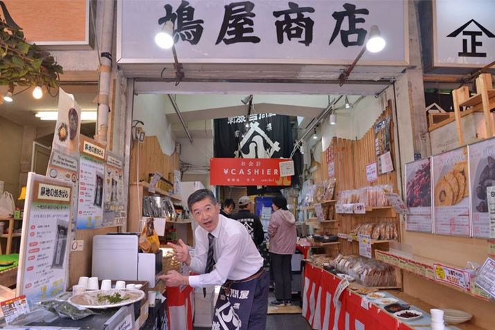 鵜飼友義店主。「どうぞ〜!」と気さくに試食させてくれる、ノリのよさ!