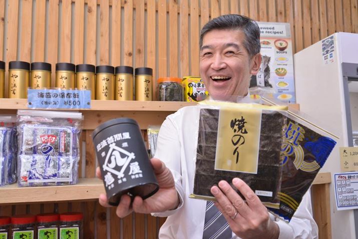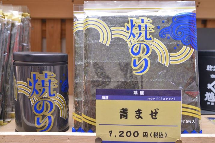 鳩屋海苔店で扱っている海苔は、鵜飼さんが各地の海苔を食べて厳選したものばかり。写真で鵜飼さんが持っている海苔は、左から「千葉 富津海苔」(700円)。中央には佐賀産の「初摘み」(1,200円)で、右が熊本産の「青まぜ」(1,200円)。価格の違いは、産地の違い以上に収穫時期だそう