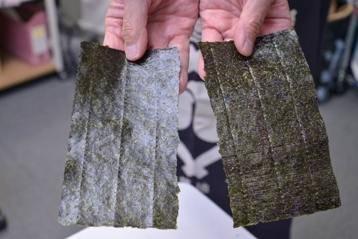 「やっぱり、あ、パリって言っちゃった。“パリパリ食感”が大事な海苔屋だけに! やはりおいしさでしょう! そして香り! なんつったって『味・香り・良し』ですよ。ただ、お寿司屋さんに限っては色の濃さとかしなり方といった、見栄えも重要視されることもございます。味・香りに加えて、口どけも気にされるお客様も多いんですよ。これらは作り手のこだわりですねぇ。自然相手なものですから、やはりバラつきは出てきてしまうんですが、なるべく理想に近づけたいと頑張ってらっしゃるんですよ」(鵜飼さん)