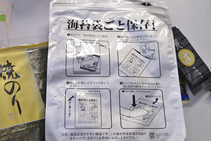 そして買った後の海苔についても。海苔にとっての大敵は湿気。そのため、海苔の袋には乾燥剤が入っていますが、密閉できない袋や缶は湿気やすく、なおかつ普通の透明な袋は防湿効果がイマイチ。そのため、アルミなどが使われた専用の袋で保存をすべきだとか。