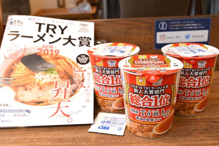 右がそのカップ麺で、左の雑誌が「第19回 業界最高権威 TRYラーメン大賞 2018-2019」。表紙はラーメン店「Tombo」のラーメンの写真です。ちなみに「TRY」とは「Tokyo Ramen of the Year」の略