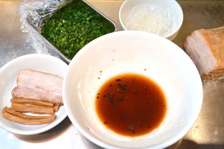 お店で使われる実際の「秘伝の醤油ダレ」。褐色の薬味は、玉ネギ、長ネギ、ニンニク、生姜、ベルギーエシャロットを焦がした香油。これが、ふくよかな風味をプラスします