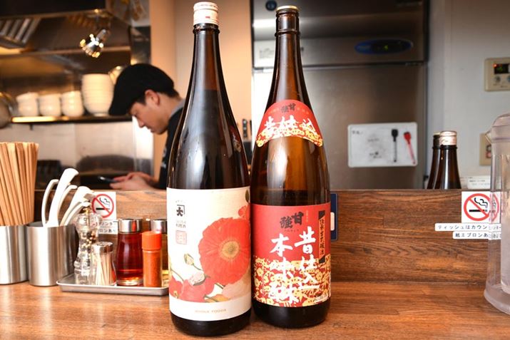 同店の味作りに欠かせない、福島県にある蔵元「大木代吉本店」の「こんにちは料理酒」(左)と、愛知県の甘強(かんきょう)酒造「昔仕込本味醂(みりん)」(右)