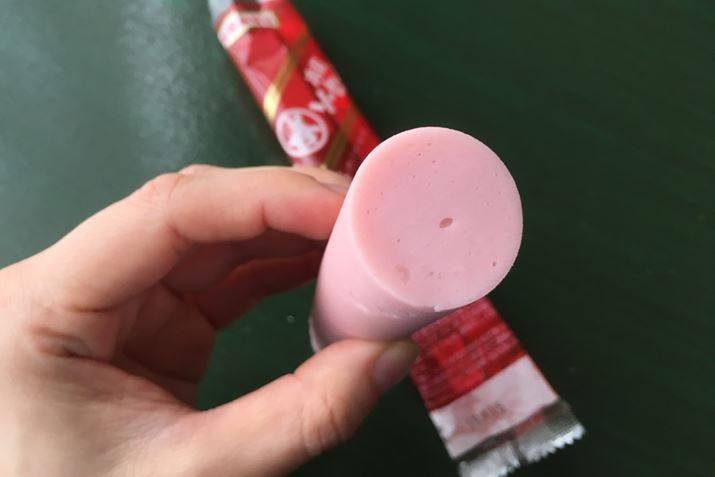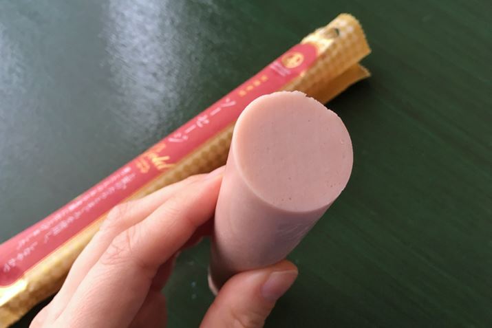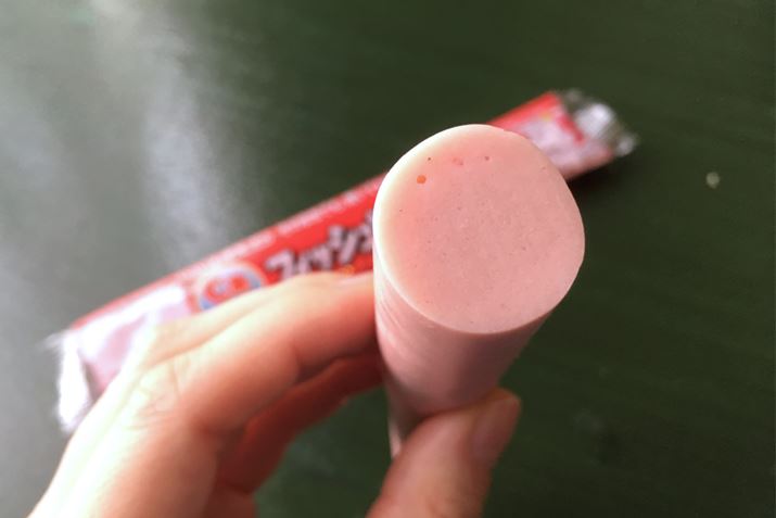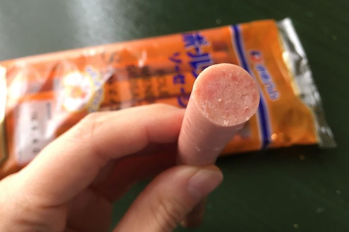 ニッスイの魚肉ソーセージ。トマトのリコピンとくちなしで自然に着色しているのが特徴。結構味がしっかりガツンとしています! うまみがあって、今回食べ比べた魚肉ソーセージのなかでもだいぶ濃いめですね。四角い赤シール付きタイプなのでとにかくむきやすいのがいい! 1本で1日に必要なカルシウムの半分が摂取できるのもポイント。しっかり味が付いていて結構ペパーミント好みの味でした。