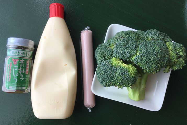 3:ブロッコリーの粗熱がとれたら、軽く水分を取り、輪切りにしたギョニソと一緒に1で作ったマヨ柚子胡椒にあえて混ぜます。