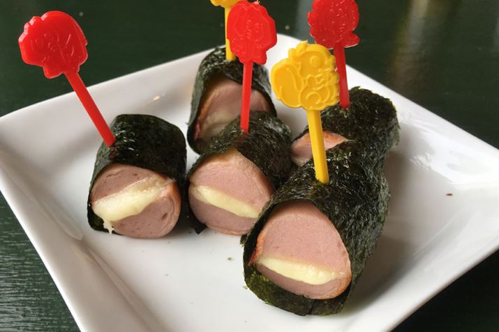 5:やけどに注意しながら、焼き海苔でくるっと巻いてピンを挿したらできあがり!