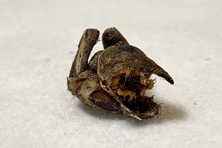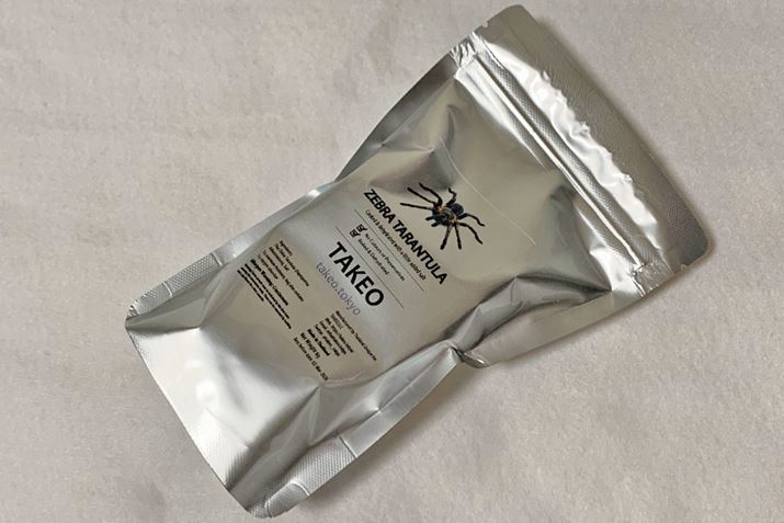 ゼブラタランチュラという種類のクモです。こちらも加熱処理後に乾燥、塩で味付けされています。乾燥のため縮こまってしまい、タランチュラの迫力が感じられないのがちょっと残念……
