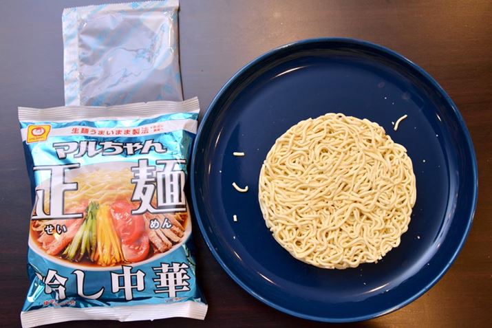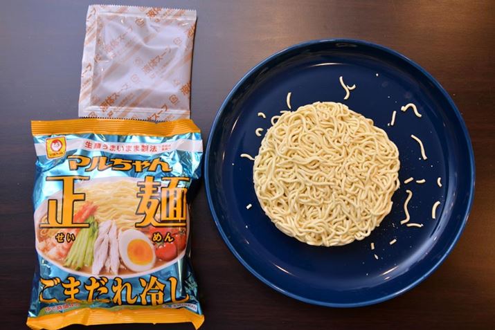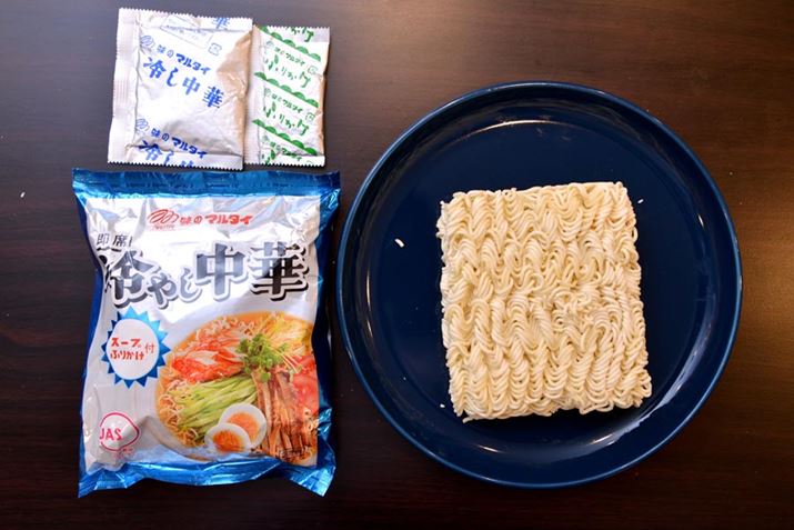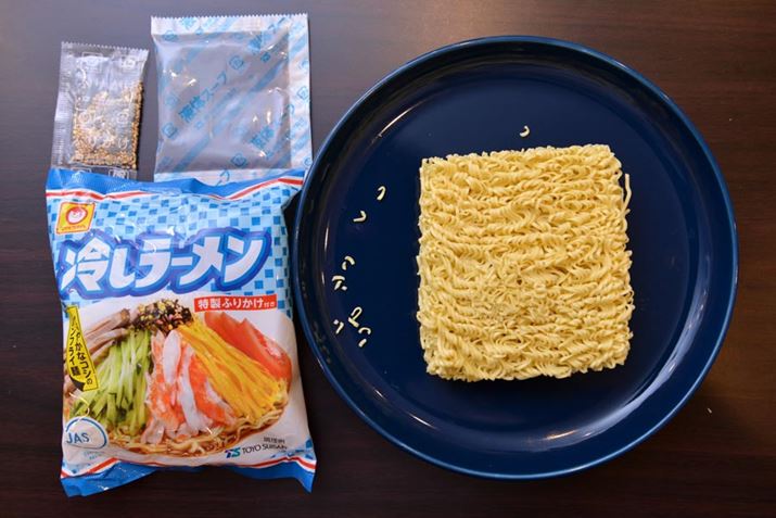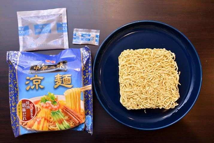 続いては九州・福岡からの刺客。マルタイといえば「棒ラーメン」でおなじみですが、こちらはフライ麺を使った夏季限定の「冷やし中華」です。タレは今回唯一の粉末タイプで、水に溶かして使うところがユニーク。こちらもふりかけが付いています。