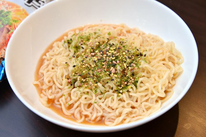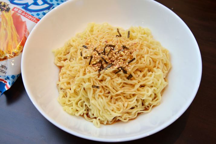 青のりの磯感と、黒ゴマの香ばしさが風味よく演出するふりかけも効果抜群。麺はモッチリとしておいしく「ノンフライがなんだ!」と言わせるような説得力があります。