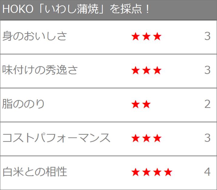 HOKOは、戦後まもなく創業した株式会社宝幸のブランド。現在は日本ハムグループで、チーズやフリーズドライなども手がけています。そんな同社の「いわし蒲焼」は、国内工場で製造した正統派の味わいが特徴。