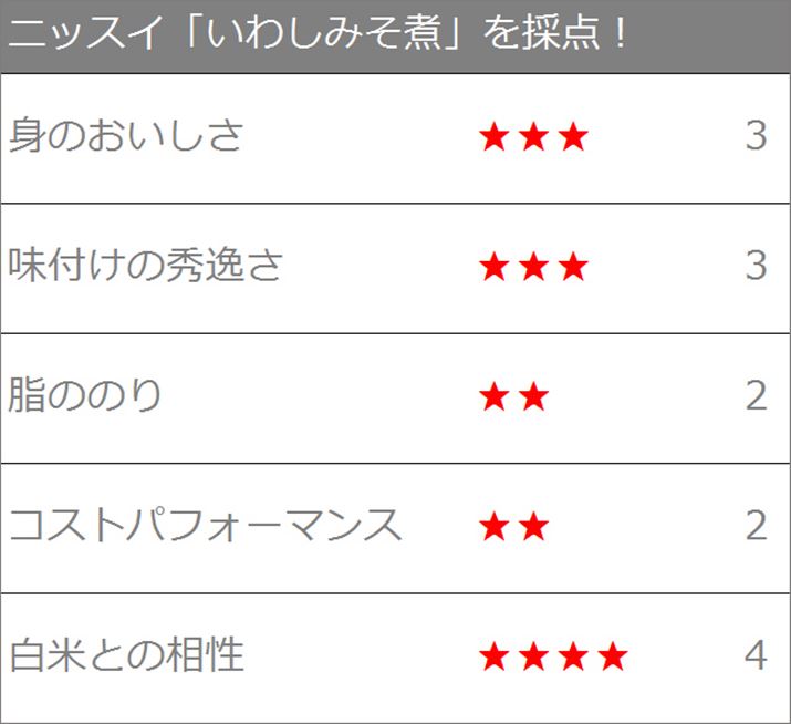 本商品は、旬の時季に水揚げされた国内水揚げのイワシを厳選。味付けには、熟成に6か月以上かけた濃口醬油である八木澤商店の「いわて丸むらさきしょうゆ」を使用しています。煮汁は甘じょっぱくておいしいのですが、汁の油分が多い印象で、その分、醬油のウマみが抑えられ、塩味だけ前面に出ているような気がしました。